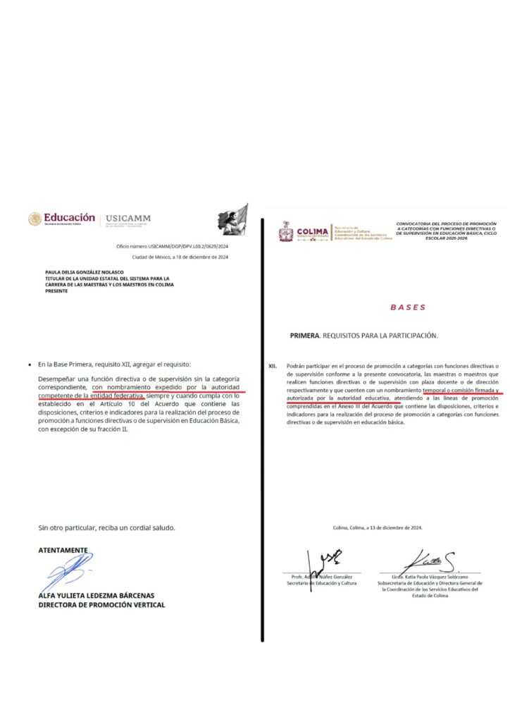 De la misma manera, expuso que, el pasado 29 de julio recibió vía correo electrónico oficio remitido por la Unidad del Sistema para la Carrera de las Maestras y delos Maestros Federal (UESICAMM) y que contiene consideraciones específicas autorizadas por la USICAMM a UESICAMM Colima para modificar la Convocatoria del proceso de promoción a categorías con funciones directivas o de supervisión en educación básica, ciclo escolar 2025-2026, que NO coincide con lo publicado por el Estado en su Convocatoria, pues estos agregan la posibilidad de participación para quienes cuenten con un nombramiento temporal y una comisión firmada, lo cual no fue autorizado por la USICAMM Federal.