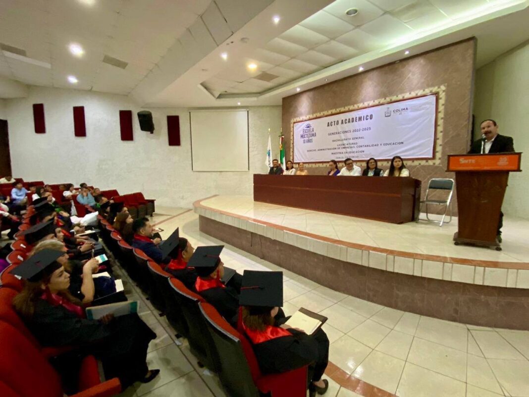 Este fin de semana se llevó a cabo el Acto Académico de Graduación de Escuela Moctezuma, donde se entregaron certificados y títulos a egresados de Bachillerato, Licenciatura y Maestría, quienes concluyeron satisfactoriamente sus estudios y recibieron sus documentos en una emotiva ceremonia, realizada en los espacios del auditorio de la Sección 39 del SNTE, evento que contó con la presencia de la presidenta de Villa de Álvarez, Mtra. Tey Gutiérrez y del Mtro. Federico Rangel Lozano, regidor del H. Ayuntamiento de Colima, en representación del alcalde capitalino, Riult Rivera, como invitados especiales.