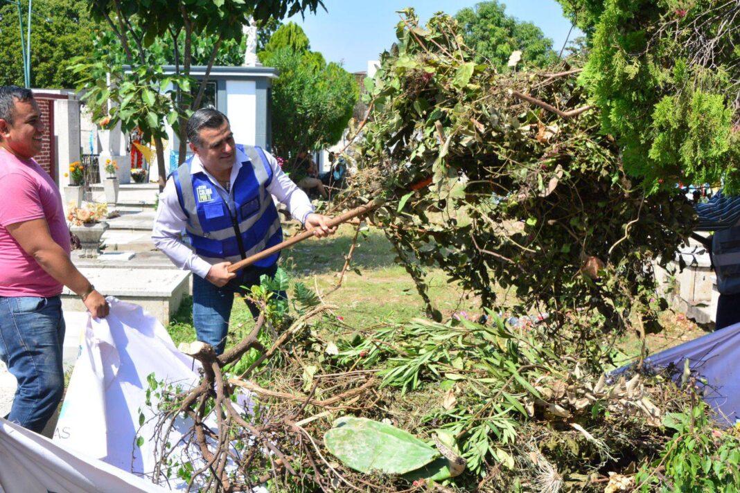 Desde temprana hora, personal de distintas áreas del Ayuntamiento se encuentra trabajando de manera permanente en el retiro de residuos, hojas secas y restos de flores, derivado de la alta afluencia de familias que acuden a rendir homenaje a sus seres queridos.