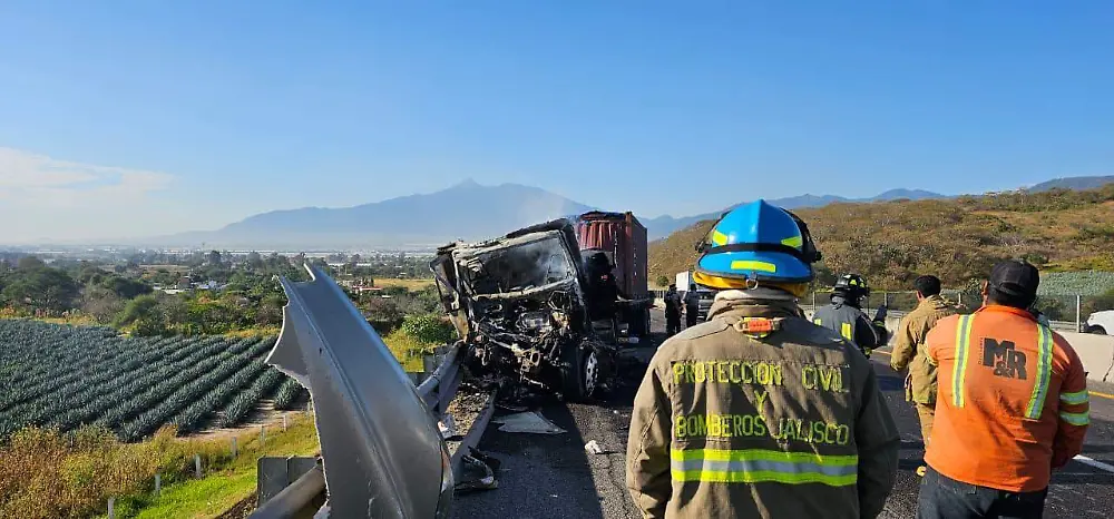 Un tráiler se incendió en la autopista Colima-Guadalajara al salir de su carril e impactarse contra la valla de contención, por lo que bomberos de Gómez Farías acudieron para sofocar el fuego y auxiliar al conductor.