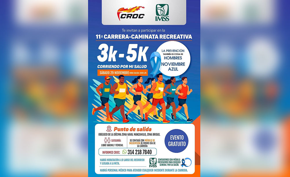 El Instituto Mexicano del Seguro Social (IMSS) en Colima invita a la población a participar en la 11ª Carrera–Caminata Recreativa “Corriendo por mi Salud”, programada para el sábado 29 de noviembre a las 08:00 horas. La actividad forma parte de las acciones permanentes de fomento a la cultura del autocuidado y de promoción de estilos de vida saludables.