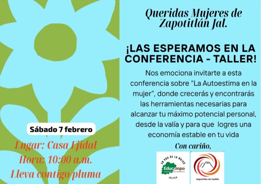 Realizarán este sábado (mañana) a las 10 de la mañana en la Casa Ejidal la Conferencia-Taller “La Autoestima en la Mujer” y es organizada por En Pro de la Mujer Educampo Jalisco y Regidoras y Regidores en Movimiento Zapotitlán de Vadillo.