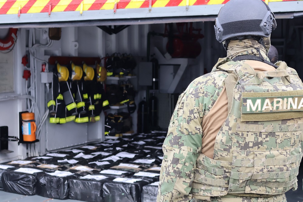 Ciudad de México. En el marco de las acciones permanentes para mantener el Estado de derecho, la Secretaría de Marina a través de la Armada de México en funciones de Guardia Costera, informa que, durante operaciones de vigilancia y seguridad marítima, se logró el aseguramiento de aproximadamente 188 bultos que representan varias toneladas de presunta cocaína, en espera de que las autoridades competentes determinen el peso ministerial.