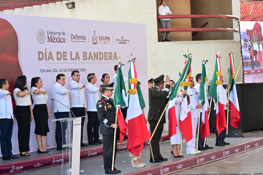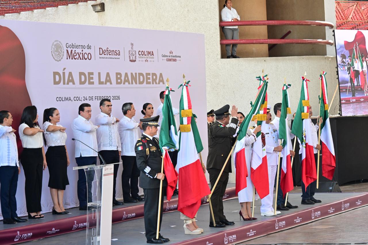 Colima, Col , 24 de Febrero de 2026.- El presidente municipal de Colima, Riult Rivera Gutiérrez, participó este martes en la ceremonia cívica, por el Día de la Bandera, celebrada en la explanada del Complejo Administrativo de Gobierno del Estado.