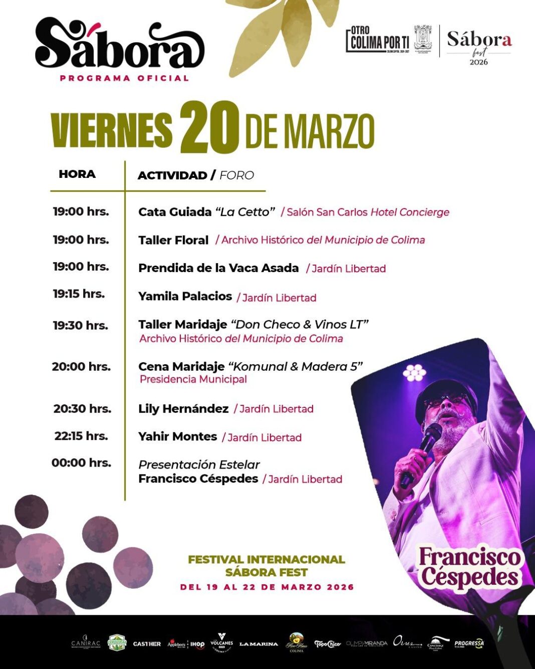 Colima, Col., 20 de marzo de 2026.- Al continuar el segundo día de actividades del Festival Internacional Sábora Fest 2026, se desarrollará una agenda muy atractiva para todos los gustos, pues continuarán realizándose las catas guiadas, los talleres vinícolas y artísticos, y se tendrá la presentación del internacional cantante cubano Francisco Céspedes.