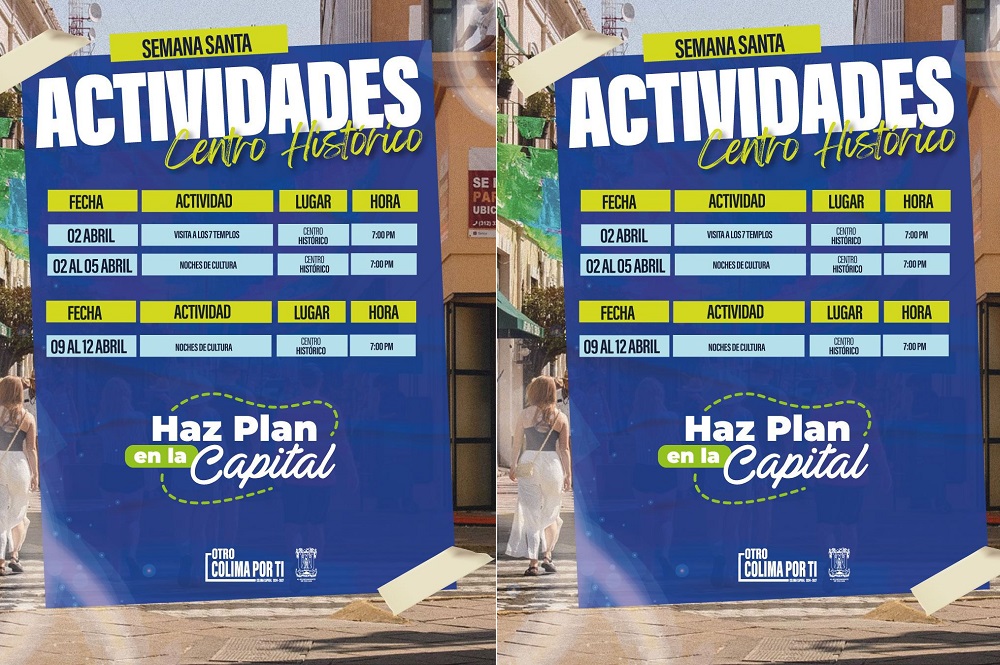 Por lo que respecta a las actividades en el centro de la ciudad de Colima, el jueves 2 de abril, a partir de las 19:00 horas, se tiene prevista la Visita a los 7 Templos, esto en las parroquias del centro de la ciudad de Colima.