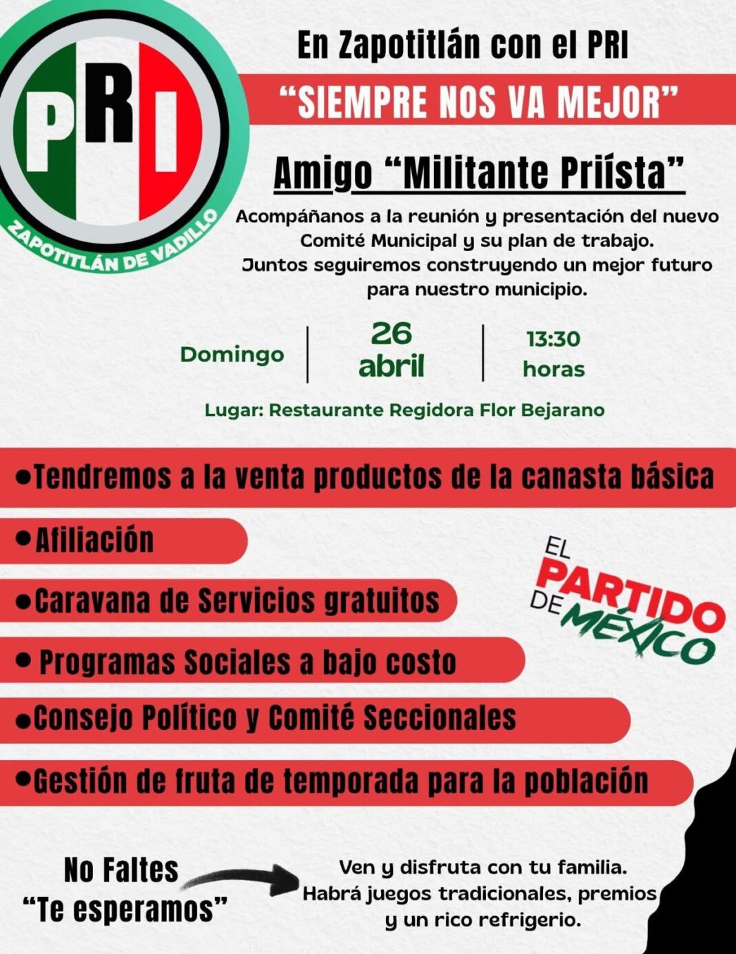 que se efectuará el domingo 26 de abril de 2026 a la 1:30 de la tarde en el Restaurante de la Regidora Flor Bejarano.