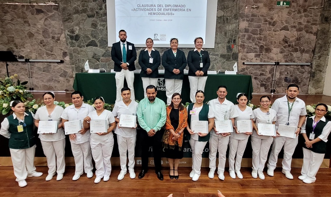 El Instituto Mexicano del Seguro Social (IMSS) en Colima llevó a cabo la entrega de constancias del Diplomado “Actividades de Enfermería en Hemodiálisis”, como parte de las acciones del Programa de Seguridad Sanitaria en el marco de “Todas las licencias, Todos los Hospitales”, con lo que reafirma su compromiso con la mejora continua de los servicios de salud.